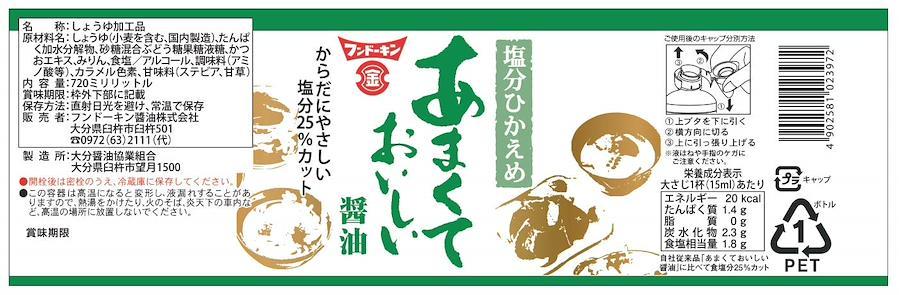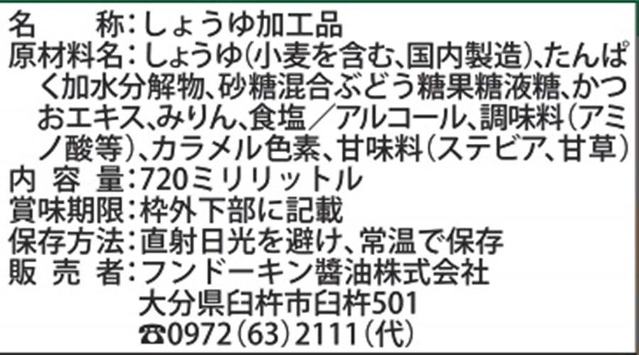 原材料:しょうゆ(小麦を含む、国内製造)、たんぱく加水分解物、砂糖混合ぶどう糖果糖液糖、かつおエキス、みりん、食塩/アルコール、調味料(アミノ酸等)、カラメル色素、甘味料(ステビア、甘草)