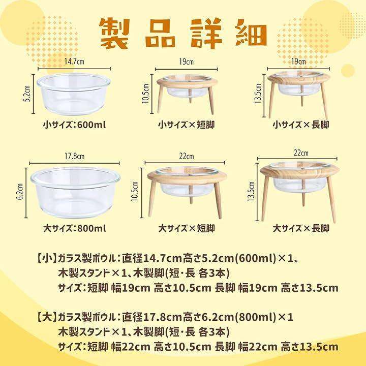 「M」ガラス製ボウル:直径14.7cm高さ5.2cm(600ml)x1、木製スタンドx1、木製脚(短・長 各3本)、サイズ:短脚 幅19cm 高さ10.5cm 長脚 幅19cm 高さ13.5cm「L」ガラス製ボウル:直径17.8cm高さ6.2cm(800ml)x1、木製スタンドx1、木製脚(短・長 各3本)、サイズ:短脚 幅22cm 高さ10.5cm 長脚 幅22cm 高さ13.5cm
