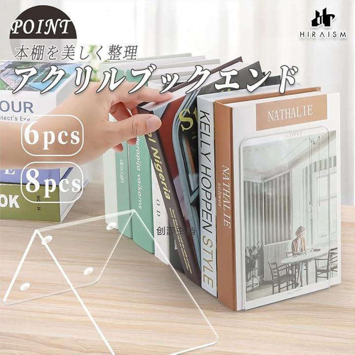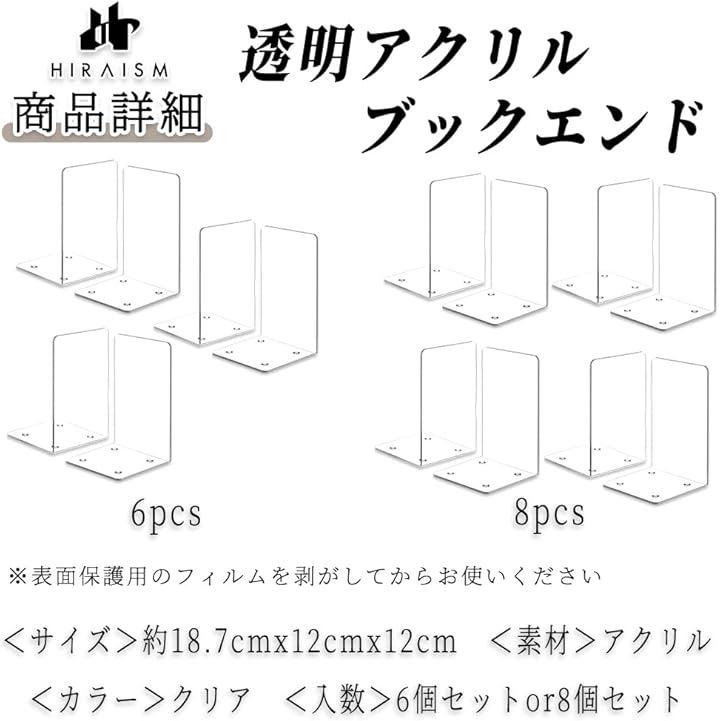 「商品内容」アクリルブックエンド <サイズ>約18.7cmx12cmx12cm <素材>アクリル <カラー>クリア <入数>6個セットor8個セット *輸送中の傷つき防止のために表面に保護シートが貼ってあるため、剝がしてからご利用ください。