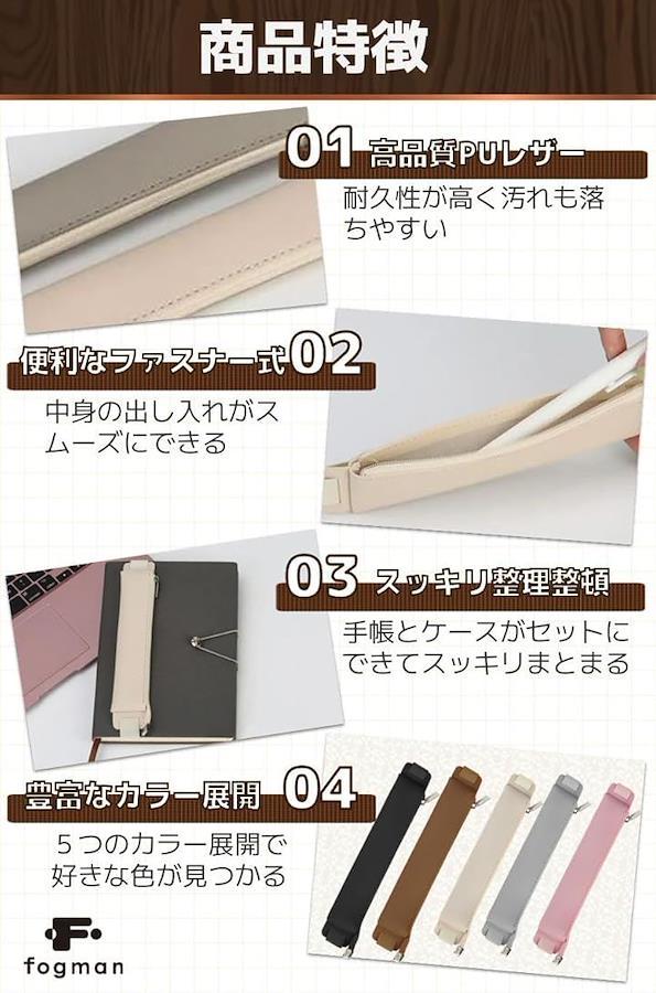 「商品特徴」(1)高品質PUレザー:耐久性が高く汚れも落ちやすい/(2)便利なファスナー式:中身の出し入れがスムーズにできる/(3)スッキリ整理整頓:手帳とケースがセットにできてスッキリまとまる/(4)豊富なカラー展開:5つのカラー展開で好きな色が見つかる