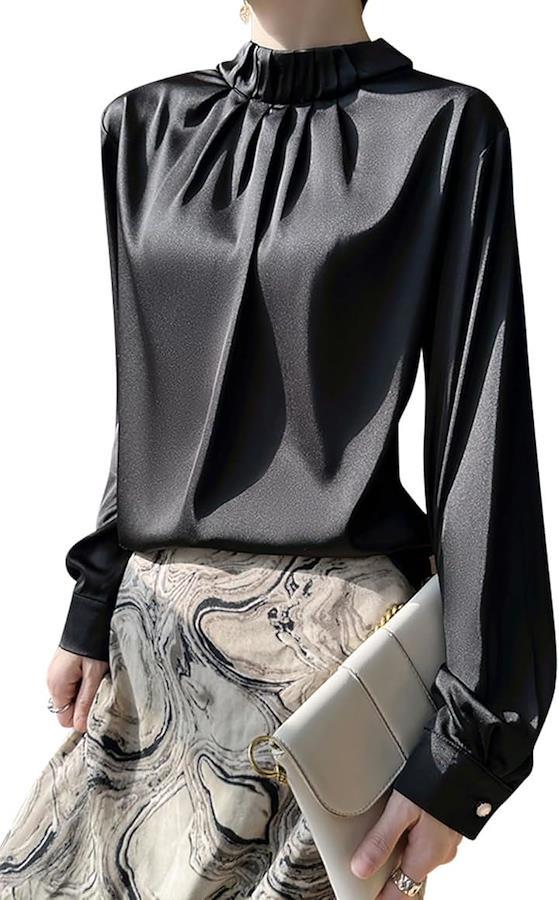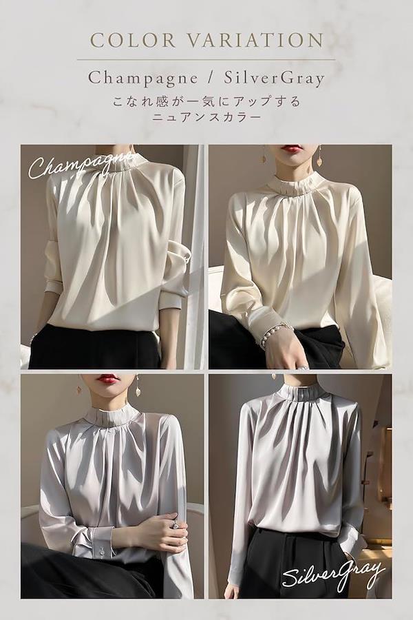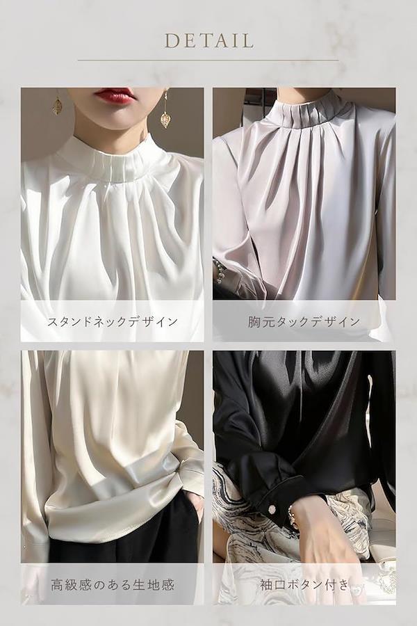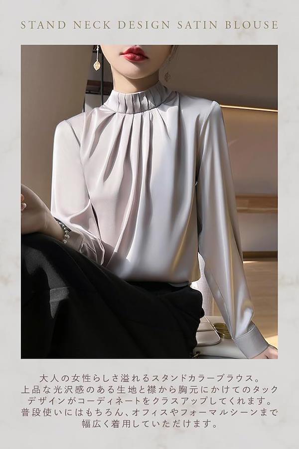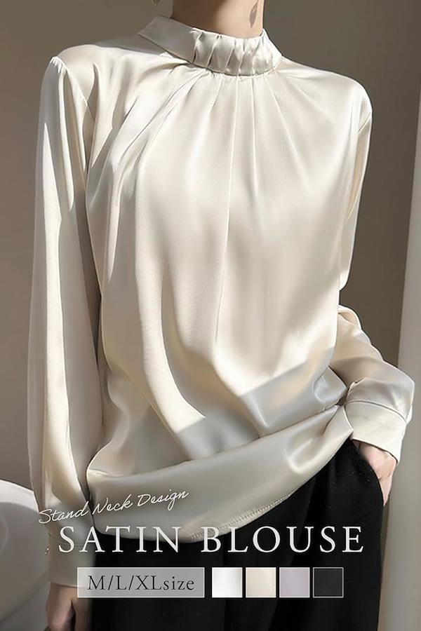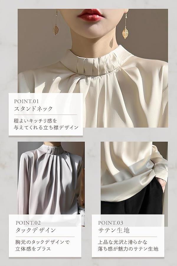 ポイント(1):大人の女性らしさ溢れるスタンドカラーブラウス。上品な光沢感のある生地と襟から胸元にかけてのタックデザインがコーディネートをクラスアップしてくれます。