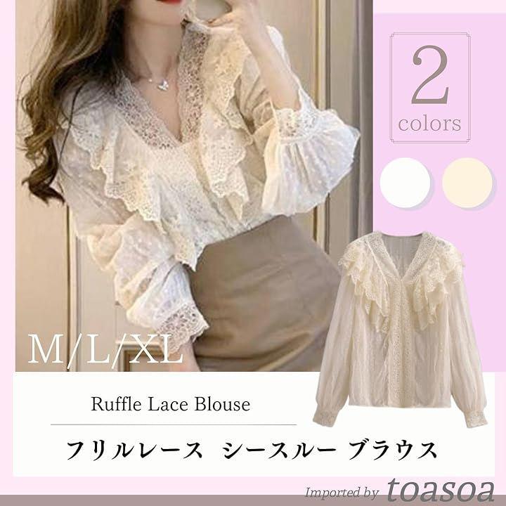 vネックの襟元と大きいフリルが特徴的なレース ブラウス トップス。
