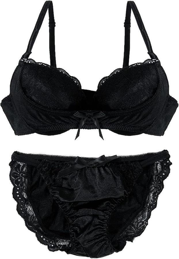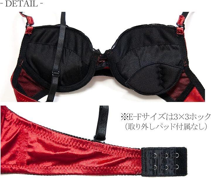 *ブラジャー:ワイヤーあり ストラップ取り外し・調節〇 サイドボーン〇 透け感・伸縮性〇 パッドポケット〇(E・Fサイズx) 下厚内蔵カップ1cm 取り外しパッド〇(E・Fサイズx) 2x3ホック(E・Fサイズ 3x3ホック) ショーツ:フルバック