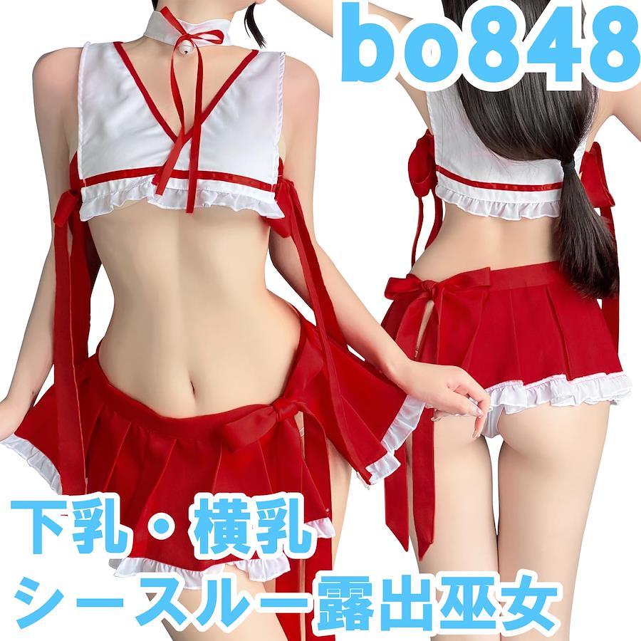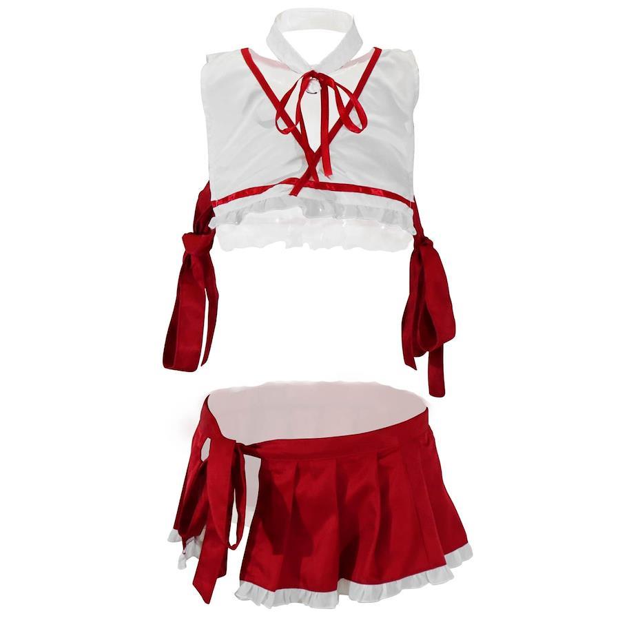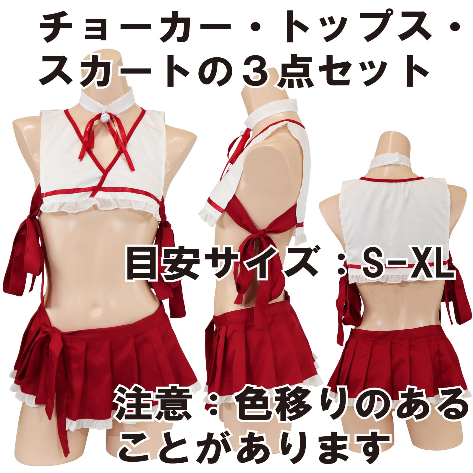 【特徴】やや暗めの赤(えんじ色)のミニスカートの袴のついた、巫女さんのセクシーなコスプレの服。横乳・下乳見せの、エッチな和服の和装の衣装。首のチョーカーについている鈴は、フェイクではなく、きちんと鳴ります。【素材】ポリエステル100%【目安サイズ】S-2L(LL、XL) ※ チョーカーは、3Lの男性の首でも、マジックテープをギリギリまで伸ばせば、なんとか留まります。トップスの首は、3Lの男性でも余裕で入ります。【首チョーカー】首周り最大37cm、チョーカー丈3cm 【トップス】バスト最大206cm、前側の着丈(肩上部から前の裾まで)27cm、後ろ側の着丈30cm 【ミニスカートのはかま】ウエスト最大116cm、着丈21cm【注意】下着はついていません。トップスの襟まわりの赤い部分はゴムになっており、伸びます。トップスの生地・サイドのヒモ、ミニスカートの生地・ヒモは、伸縮性はありません。 【商標登録番号】登録5745978(#lf)(#lf)(#lf)商品購入前に、ストア紹介ページをご確認ください。