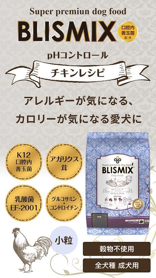 ブリスミックス ドッグフード pHコントロール チキンレシピは、従来のブリスミックス同様、お口の状態を整えてくれる 口腔内善玉菌 K12 を配合、さらにアガリクス茸・乳酸菌 EF2001・グルコサミン・コンドロイチンがプラスされています。 グレインフリー(穀物不使用)のチキンを主原材とした小粒タイプの ドッグフードです。