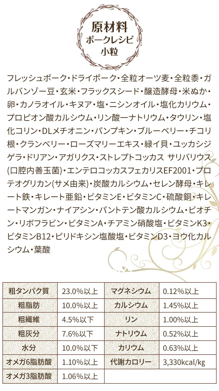 【原材料】フレッシュポーク・ドライポーク・全粒オーツ麦・全粒黍・ガルバンゾー豆・玄米・フラックスシード・醸造酵母・米ぬか・卵・カノラオイル・キヌア・塩・ニシンオイル・塩化カリウム・プロピオン酸カルシウム・リン酸一ナトリウム・タウリン・塩化コリン・DLメチオニン・パンプキン・ブルーベリー・チコリ根・クランベリー・ローズマリーエキス・緑イ貝・ユッカシジゲラ・ドリアン・アガリクス・ストレプトコッカス サリバリウス(口腔内善玉菌)・エンテロコッカスフェカリスEF2001・プロテオグリカン(サメ由来)・炭酸カルシウム・セレン酵母・キレート鉄・キレート亜鉛・ビタミンE・ビタミンC・硫酸銅・キレートマンガン・ナイアシン・パントテン酸カルシウム・ビオチン・リボフラビン・ビタミンA・チアミン硝酸塩・ビタミンK3・ビタミンB12・ピリドキシン塩酸塩・ビタミンD3・ヨウ化カルシウム・葉酸