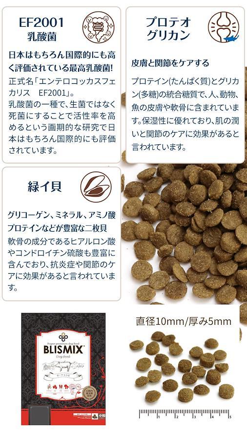 従来のブリスミックス同様、お口の状態を整えてくれる 口腔内善玉菌 K12 を配合、さらにアガリクス茸・乳酸菌 EF2001・プロテオグリカン・緑イ貝がプラスされています。 ポークを主原材とした小粒タイプの ドッグフードです。アレルギーが気になる犬に、 ぜひ一度お試しください。