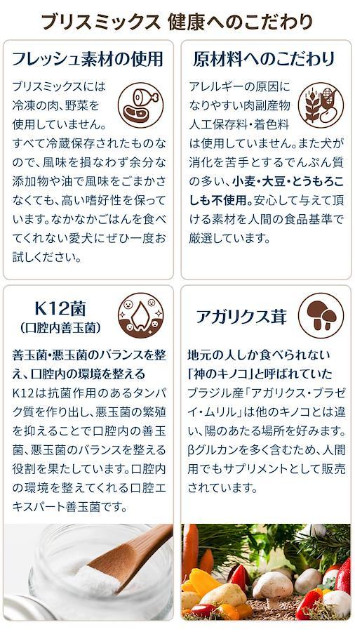 ブリスミックスには冷凍の肉、野菜を使用していません。すべて冷蔵保存されたものなので、風味を損なわず余分な添加物や油で風味をごまかさなくても、高い嗜好性を保っています。なかなかごはんを食べてくれない愛犬・愛猫にぜひ一度お試しください。ブリスミックスは、アレルギーの原因になりやすい肉副産物・人工保存料・着色料は使用していません。また犬・猫が消化を苦手とするでんぷん質の多い、小麦・大豆・とうもろこしも不使用。愛犬・愛猫に安心して与えて頂ける素材を人間の食品基準で厳選しています。ブラジル産「アガリクス・ブラゼイ・ムリル」は通常、日の当たらない所で育つ他のキノコとは違い、陽のあたる場所を好みます。また長期保存ができず人工栽培も非常に難しかったため、地元の人しか食べられない「神のキノコ」と呼ばれていたそうです。他のキノコとは違い、βグルカンを多く含むため、人間用でもサプリメントとして販売されています。正式名「エンテロコッカスフェカリス EF2001」。乳酸菌の一種で、生菌ではなく死菌にすることで活性率を高めるという画期的な研究で日本はもちろん国際的にも評価されています。K12 は抗菌作用のあるタンパク質を作り出し、悪玉菌の繁殖を抑えることで口腔内の善玉菌、悪玉菌のバランスを整える役割を果たしています。口腔内の環境を整えてくれる口腔エキスパート善玉菌です。