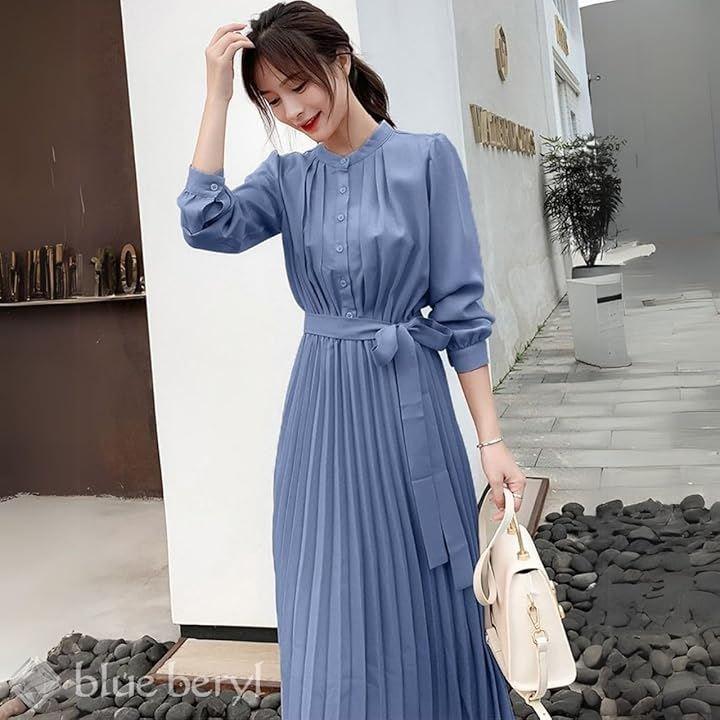 「エレガントな美シルエット」 ウエストから裾に向かって施された細かいプリーツが縦長ラインを強調し、エレガントな美シルエットを描く上品ロングワンピース。