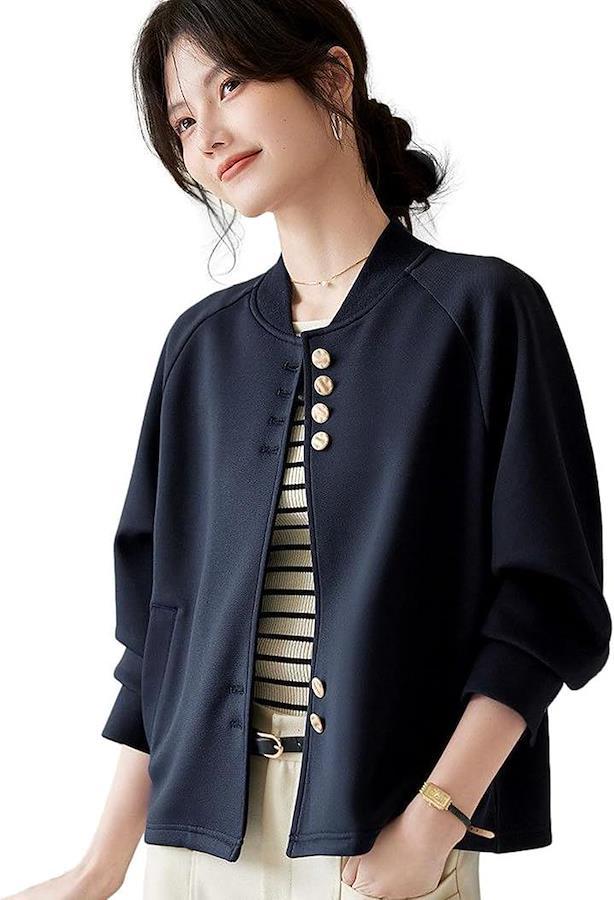 スタジャンのように、スタイルをカジュアルで軽やかな印象に仕上げてくれるラグランスリーブが、シルエットをすっきりと仕上げてくれます。