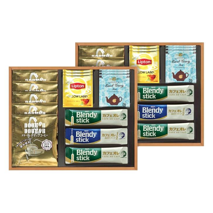 ドトールドリップコーヒー×10、リプトンイエローラベル、アールグレイ紅茶ティーバッグ×各6、ブレンディスティックカフェオレ×4、ブレンディスティックカフェオレ(カロリーハーフ)×2【乳】
