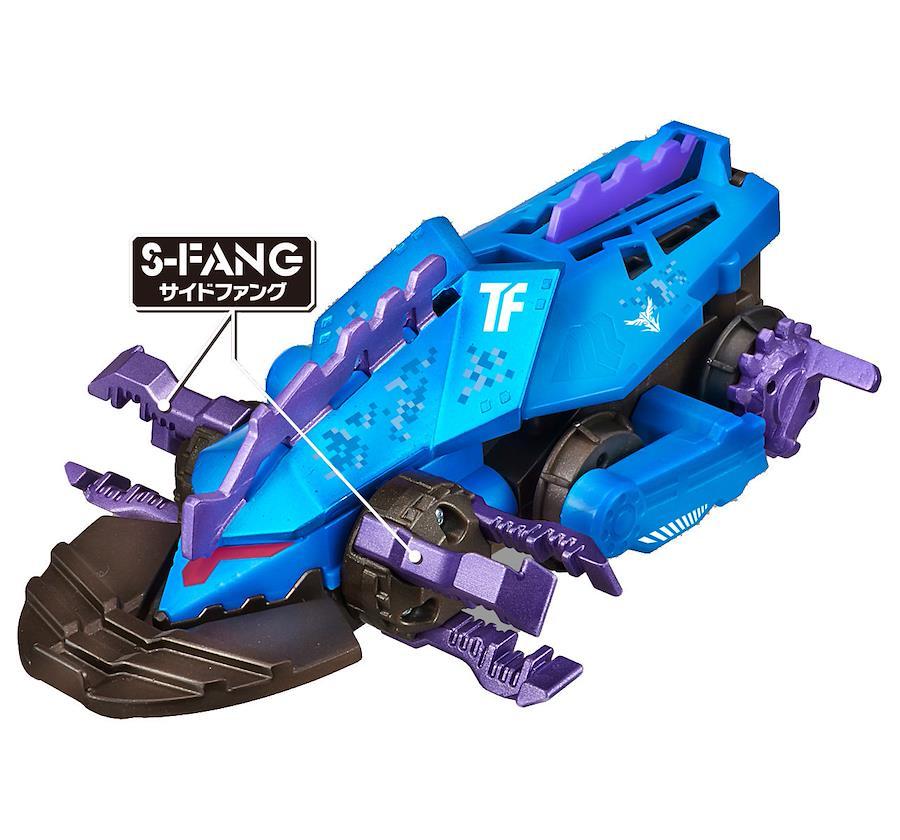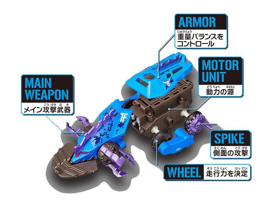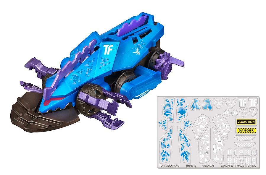 対戦型バトルホビー「ブレイク轟牙(ゴウガ)」より、 トルネードファング(カモフラブルー)が登場!側面にある二本のファング武器で相手を掴んで背後に投げる攻撃を得意とする機種。相手の攻撃を受け流しやすい防御タイプ。【セット内容】:本体1台、カスタムステッカー1枚使用電池:単4×2(別)
