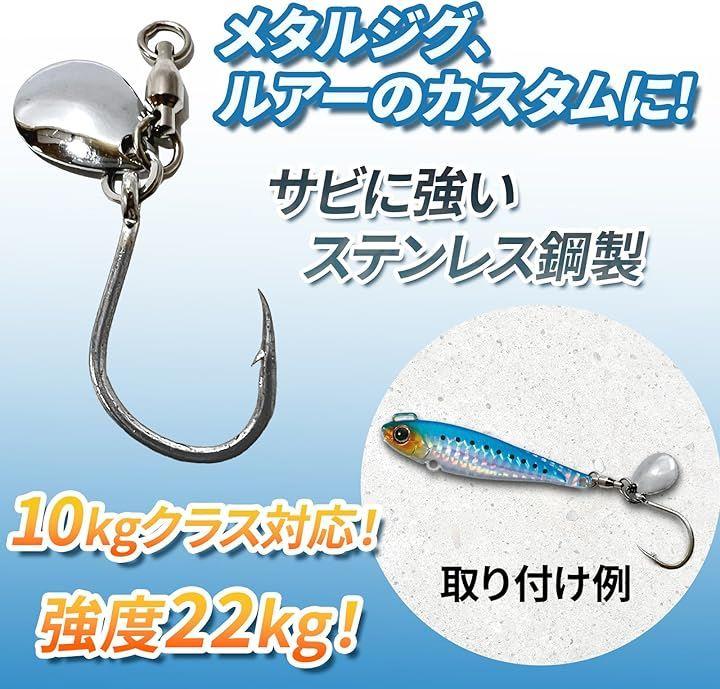 シングルフックは、ステンレス鋼製でありながら、10kgクラスの魚にもしっかり対応し、22kgクラスの強度を持っています。