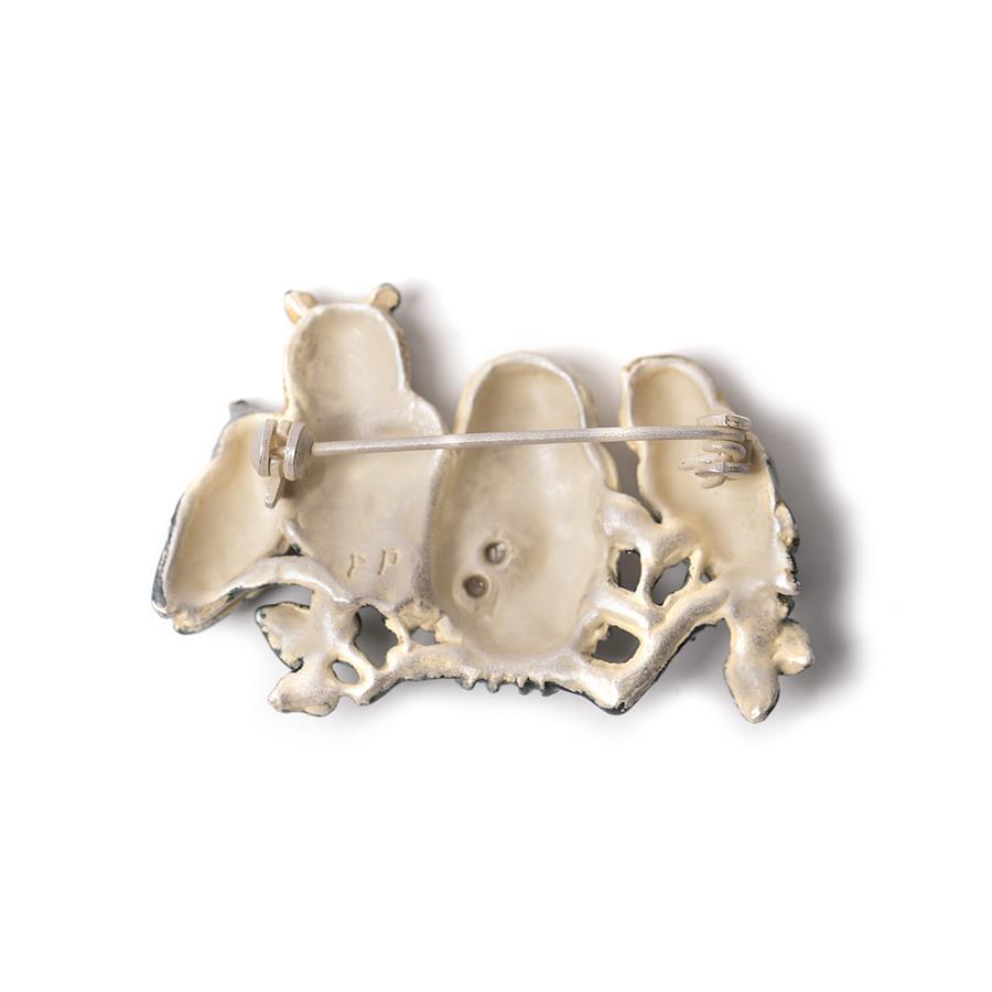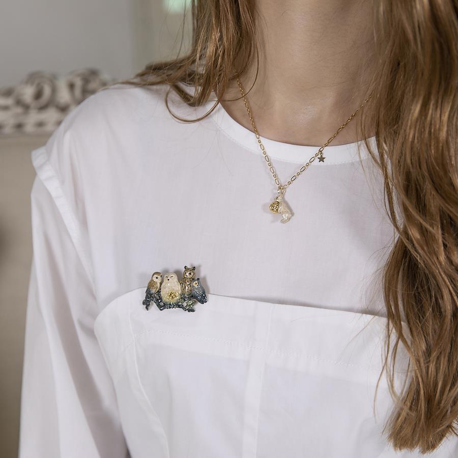 「やさしいデザイン」商品を手に取る全ての人たちにとって、やさしさを追求した商品シリーズです。個性的でありながら、シーンや装いを超えて楽しめる。その豊かな多様性が特徴です。愛着の持てる、あなたのファッションの介添人。星の周りは柔らかい明かりが映り、フクロウの羽が黄色く染まっています。星の輝きを表現するためフクロウや葉枝は明度を下げた配色にし、星から離れるほど暗く着色されています。暗い色のコートや鞄、ストールなどにつけると星の明るさが際立っておすすめです。フクロウの種類は左からメンフクロウ、シロフクロウ、ウサギフクロウ、アフリカオオコノハズクです。【素材】ピューター合金 日本製【寸法】縦約30mm×横約45mm