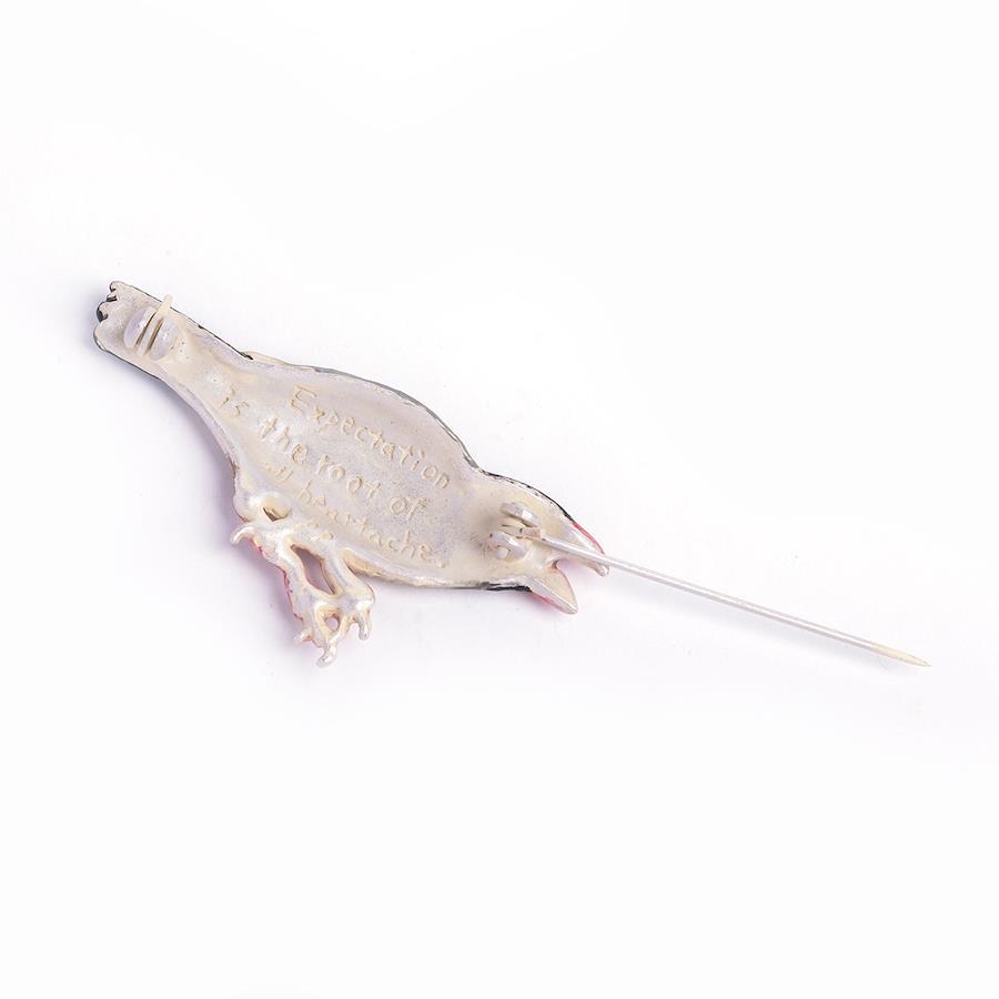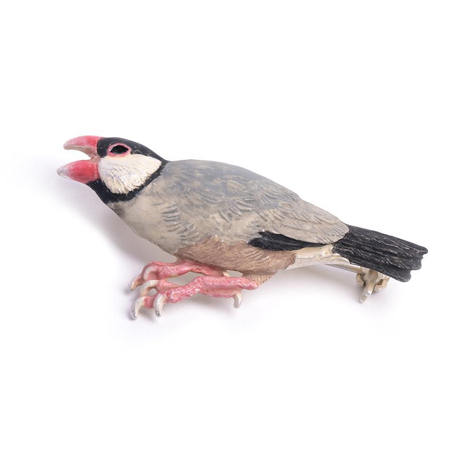 ちょっぴり怒りっぽい文鳥のブローチ。ひとつで着ければ飼い主に、他のアイテムと組み合わせればそのアイテムにプンプンと怒っている様子が表現できるユニークなアイテムです。