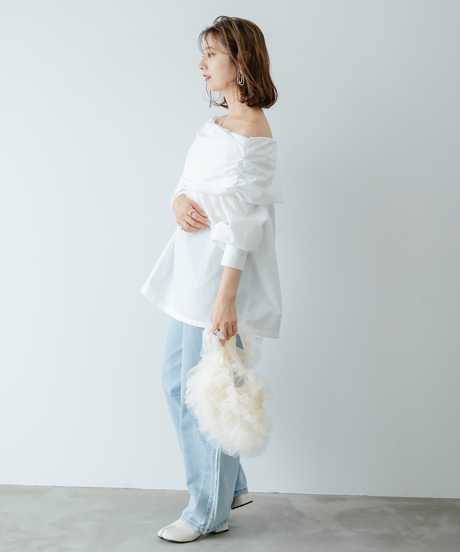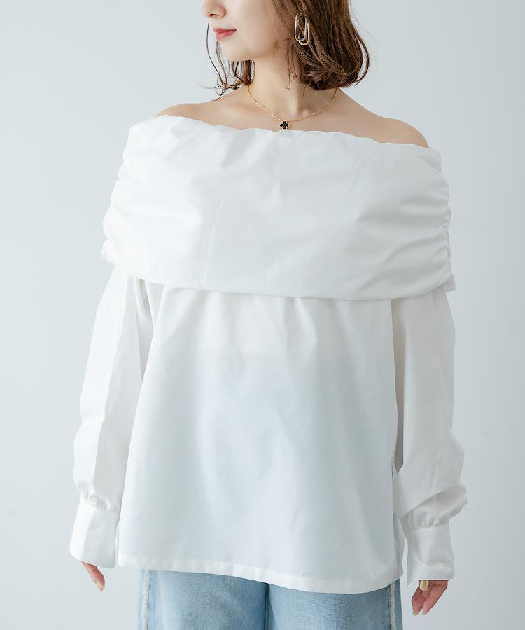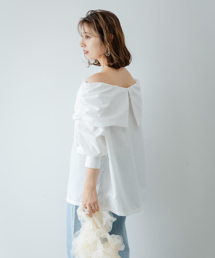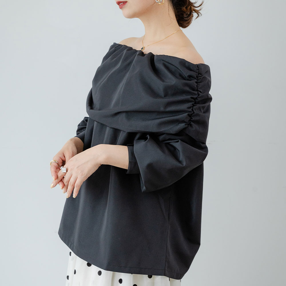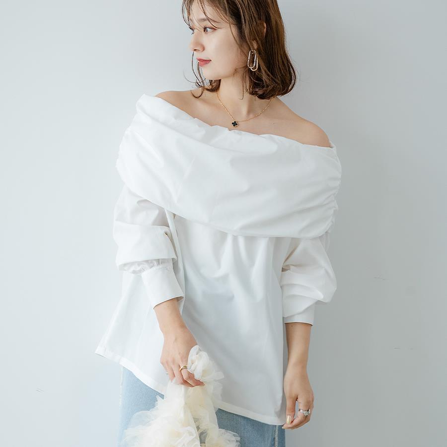 ヘルシーな肌見せで鎖骨ラインを美しく見せてくれるオフショルダーブラウス。