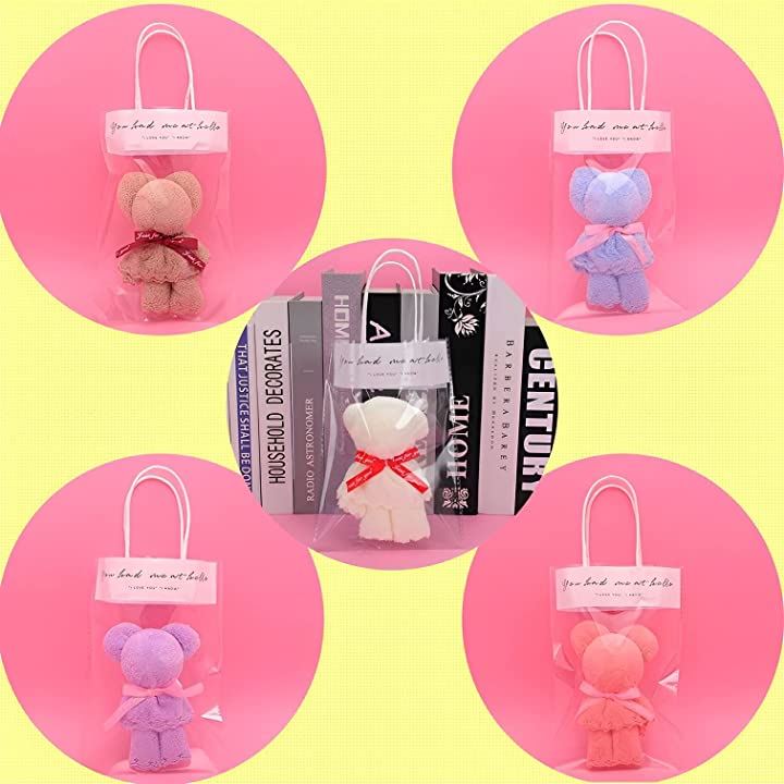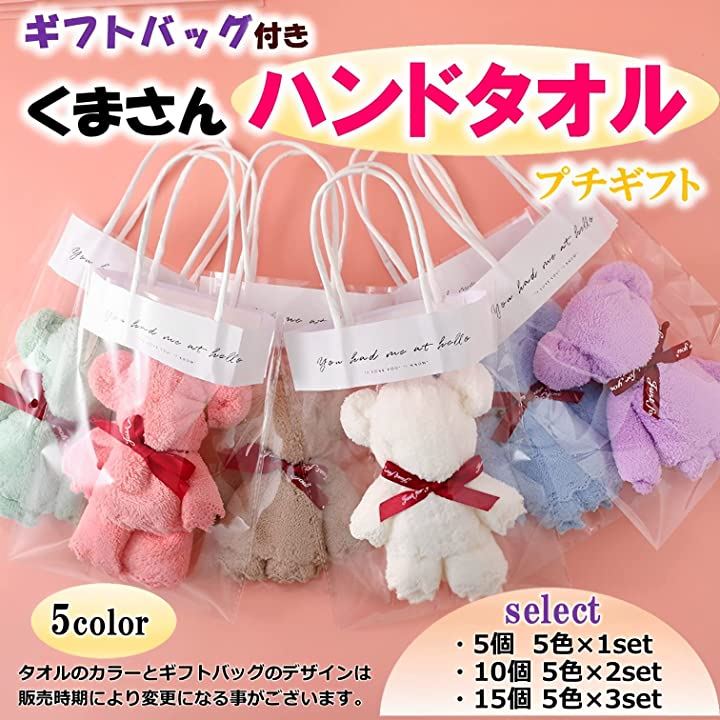 「バリエーション」5個セット くまタオル各5色x1,クリアバック 5枚、10個セット くまタオル各5色x2、クリアバック 10枚、15個セット くまタオル各5色x3、クリアバック 15枚枚よりお選びいただけます。