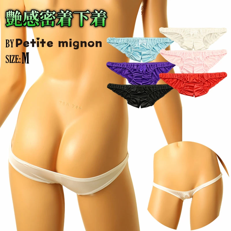 光沢感と艶やかさを兼ね備え、まるでシルクのように滑らかで心地よい肌触りが魅力のフェリカ生地を使用。極端に浅めの股上と、クシュクシュとした柔らかいインゴム仕様が特徴的な、スキャンティスタイルのフルバックショーツです。フロントはセンシュアルなオープンクロッチ仕様で、股部分が割れたセクシーなデザイン。小ぶりで大胆なシルエットが、視線を惹きつける魅力的な一枚です。