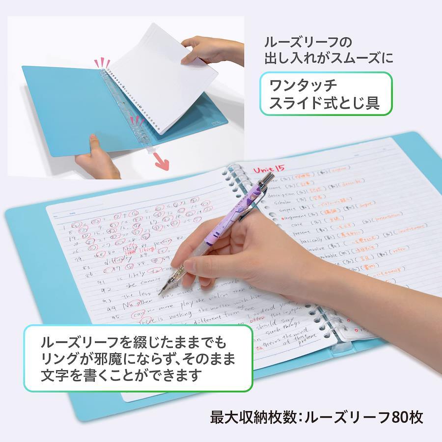 【仕様】8穴リング (B5サイズルーズリーフ対応) 【最大収納枚数】ルーズリーフ80枚