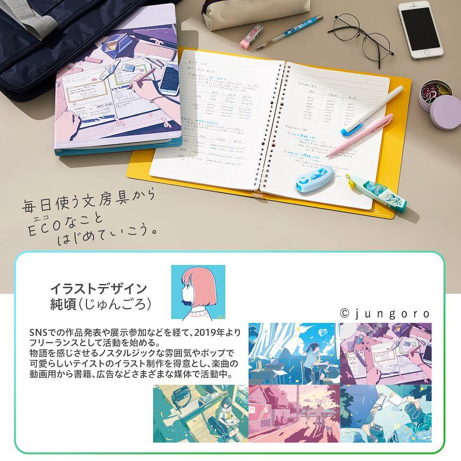 SDGs エコ文具シリーズ「 coe365 」商品をエコ仕様にするだけでなく、自然を表したイラストや絵柄とリンクした音楽を聴けるなど、「好きなもの×楽しみながら」エコに貢献することができる環境配慮型商品[環境配慮ポイント]・表紙に古紙配合70%以上再生紙を使用した紙製ルーズリーフバインダー ※グリーン購入法適合、グリーンマーク、再生紙使用マーク(R70)対応[商品特長]・合計8穴(上下4穴)のリング式、上下4穴をはめるだけでスムーズにとじることができ、出し入れが簡単・上下4穴ずつのセンターレス仕様、ルーズリーフをとじたままでもリングが邪魔にならず、そのまま文字を書くことができます・リングはフックを指で引くだけで開くワンタッチスライド式、片手で簡単に開閉が可能