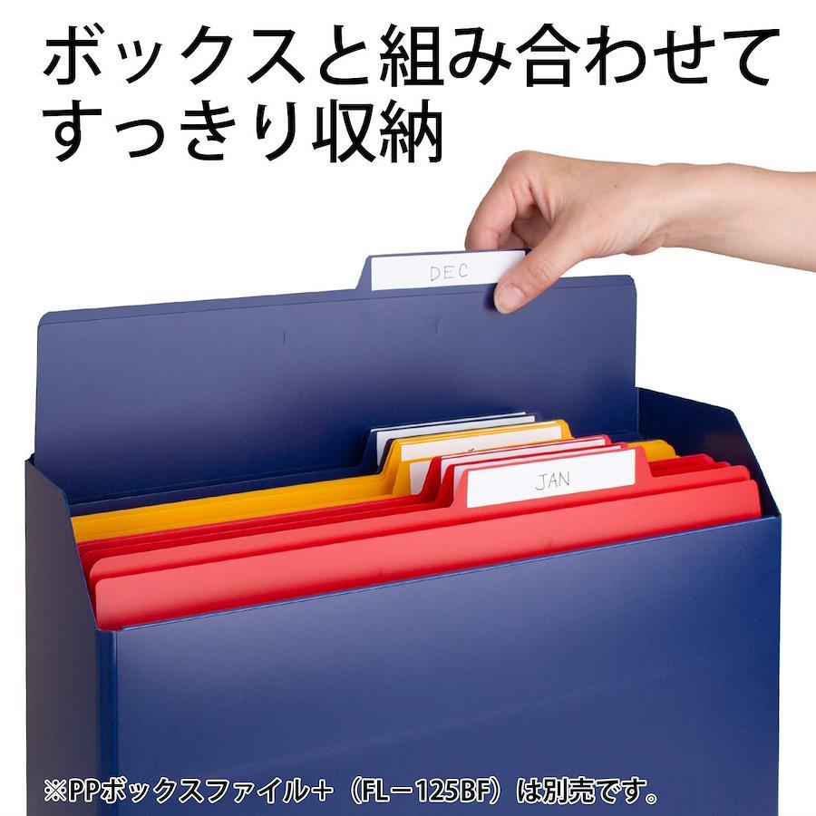 3. ボックスと組み合わせて更に便利・プラスのPPボックスファイル+シリーズと併せて使用できる3色展開・ボックスファイルとあわせてのご利用で、よりきれいに見やすく管理ができます(おすすめのPPボックスファイル+シリーズ : FL-125BF、FL-125BF-H)