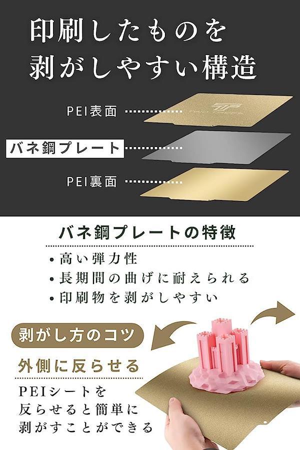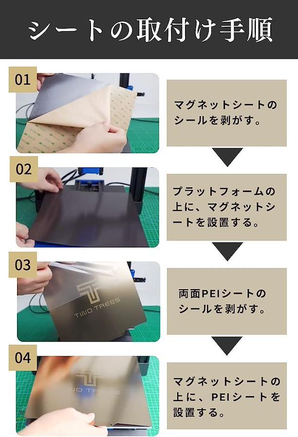 「すぐに使える」両面PEIのシート、マグネットシートが付属しており、マグネットシートをお使いの3Dプリンタに貼り付けるだけですぐに使用できます