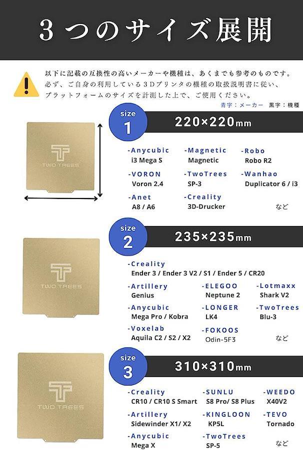 「多種多様なフィラメントに対応」ABS、PLA、PETG、木、カーボンファイバーなど、様々フィラメントに対応しています「様々な機種との互換性」3種類のサイズを用意し、主要な3Dプリンタを始め、様々な製品に対応しています*詳細は商品画像参照