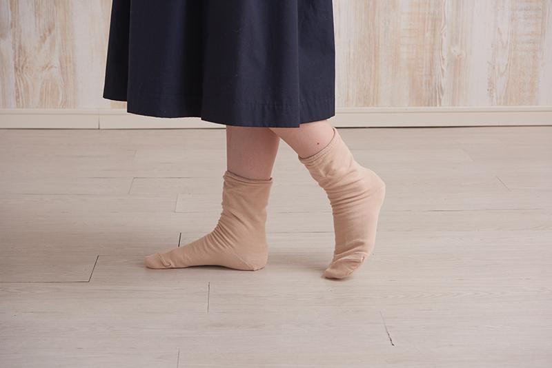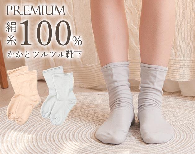 ★プレミアムな1足!上質な肌触り!*二重編の生地のかかと部分に縫製した保湿シートがお肌の潤いをしっかりキャッチし、かかとをツルツルに導きます。*肌に接する内側は絹糸100%使用し、肌に優しい設計です。*表糸は綿糸を使用し、1枚で重ね履き効果があります。*綿糸は、きめの細かいハイゲージ編み機を使用。*絹糸は、繭玉の中心に近い絹紡糸を使用。*ゴム糸は使用せず、長時間の着用でもストレス無く着用頂け、優しく足にフィットします。