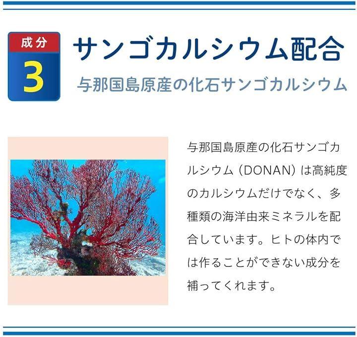 「 与那国島原産の化石サンゴカルシウム配合」 与那国島原産の化石サンゴカルシウムは高純度のカルシウムだけでなく、多種類の海洋由来ミネラルを配合しています。