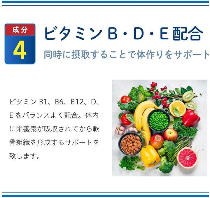 原材料:還元麦芽糖水飴、デキストリン、鮭軟骨鼻抽出物(プロテオグリカン、II型コラーゲン含有)、乾燥ビール酵母、サンゴカルシウム、セイヨウヤナギ抽出物/セルロース、ステアリン酸Ca、微粒酸化ケイ素、抽出ビタミンE、ヒアルロン酸、ビタミンB1、ビタミンB6、ビタミンD、ビタミンB12、アラビアガム
