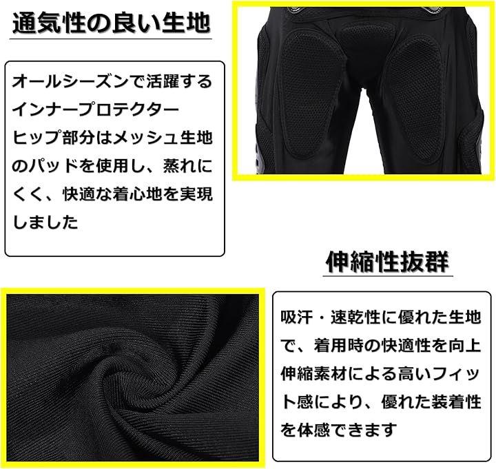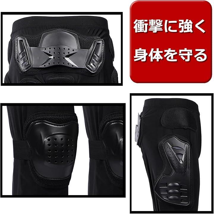 「参考サイズ(cm)」M:ウエスト66~80cm、着丈85cm、太もも回り幅26cm、ヒップ80cm、股下56cm 参考身長/体重:160cm~165cm/50kg~60kg | L:ウエスト68~84cm、着丈87cm、太もも回り26.5cm、ヒップ84cm、股下58cm 参考身長/体重:165cm~170cm/60kg~70kg | XL:ウエスト70~86cm、着丈89cm、太もも回り27cm、ヒップ88cm、股下60cm 参考身長/体重:170cm~175cm/70kg~80kg | XXL:ウエスト72~88cm、着丈91cm、太もも回り27.5cm、ヒップ92cm、股下62cm 参考身長/体重:175cm~180cm以上/80kg以上 | 重さ:530g生地:EVA(ソフト素材)、PE(ハード素材)、ポリエステル