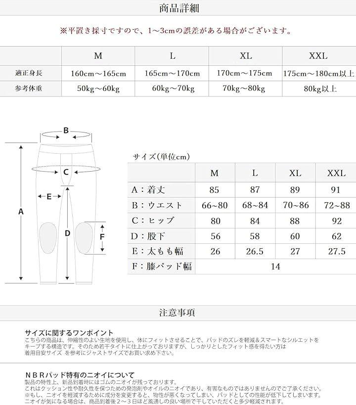 「参考サイズ(cm)」M:ウエスト66~80cm、着丈85cm、太もも回り幅26cm、ヒップ80cm、股下56cm 参考身長/体重:160cm~165cm/50kg~60kg | L:ウエスト68~84cm、着丈87cm、太もも回り26.5cm、ヒップ84cm、股下58cm 参考身長/体重:165cm~170cm/60kg~70kg | XL:ウエスト70~86cm、着丈89cm、太もも回り27cm、ヒップ88cm、股下60cm 参考身長/体重:170cm~175cm/70kg~80kg | XXL:ウエスト72~88cm、着丈91cm、太もも回り27.5cm、ヒップ92cm、股下62cm 参考身長/体重:175cm~180cm以上/80kg以上 | 重さ:530g生地:EVA(ソフト素材)、PE(ハード素材)、ポリエステル