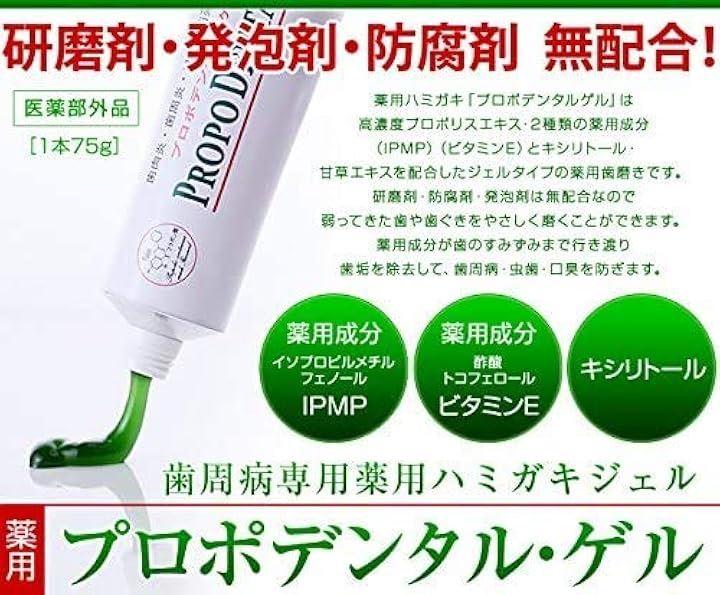 内容量:プロポデンタル・ゲル1本75g 高濃度プロポリスエキス、2種類の薬用成分とキシリトール、甘草エキスを配合したジェルタイプの薬用 歯磨き です。