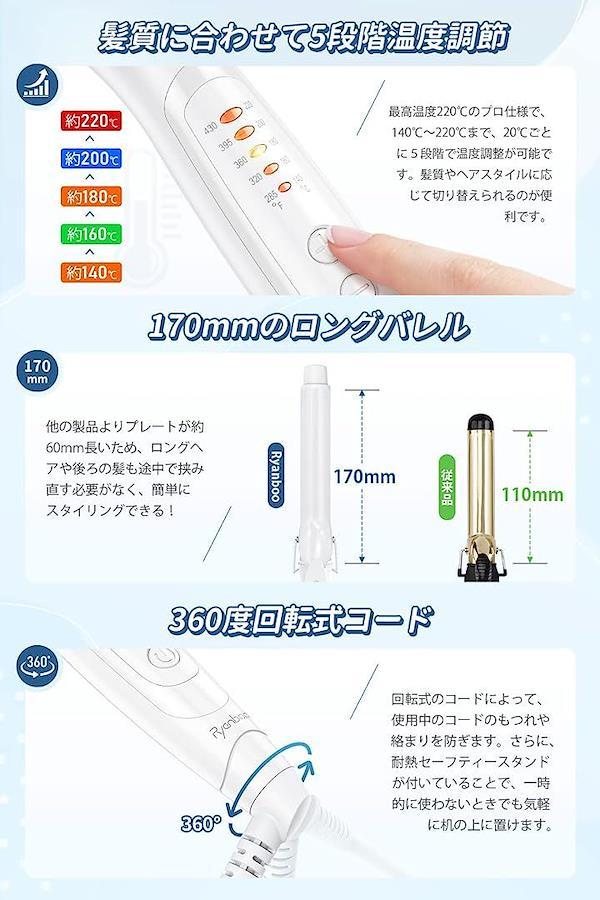 「セラミックコーティング加工」髪にやさしく素早く熱を伝えるセラミックコーティング使用しているから立ち上がりが速い。髪との摩擦が少なく、滑りがなめらか。