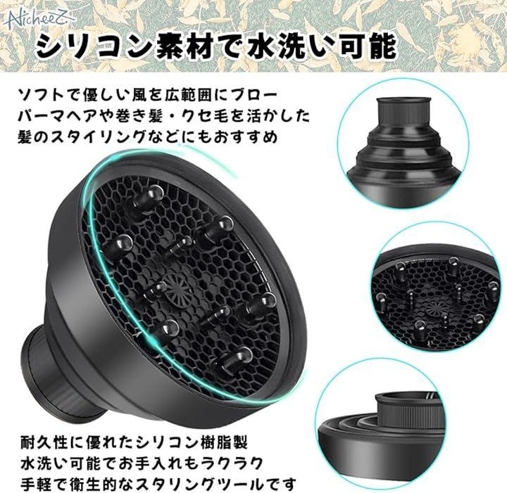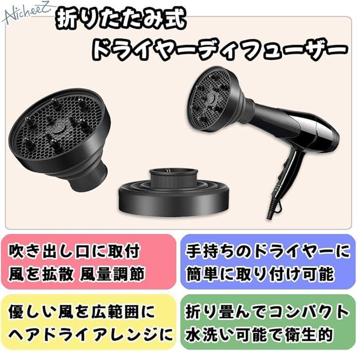 「ヘアアレンジ・ドライに最適」ドライヤーの吹き出し口に取り付けて風を拡散、風量を調節してスピーディーに髪を乾かすことができるヘアドライヤーディフューザーです。