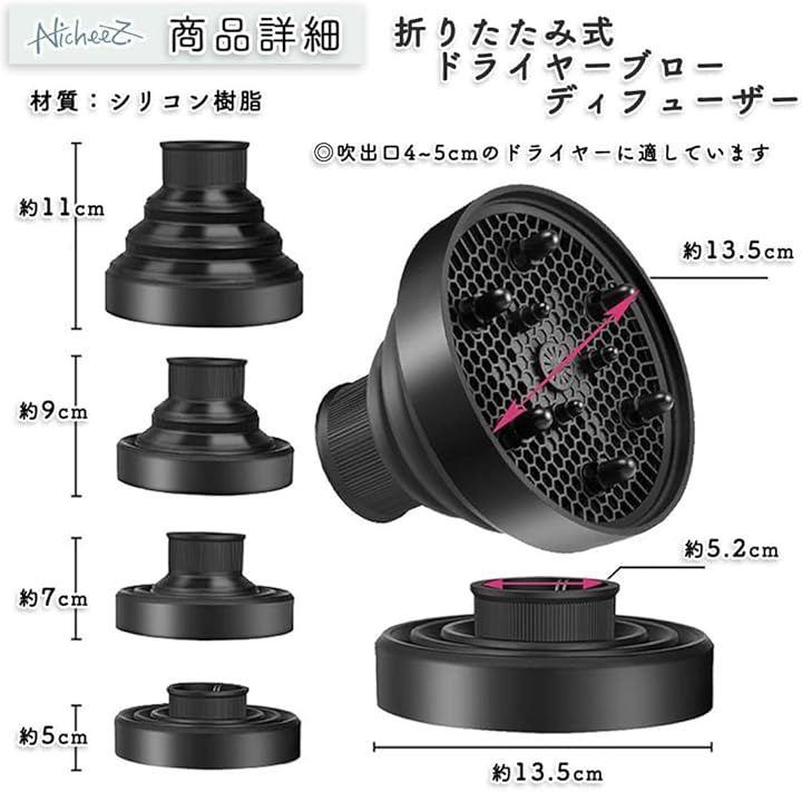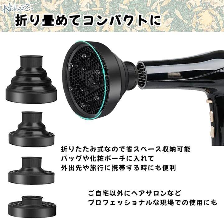 「商品内容」折りたたみ式ヘアドライヤーブローディフューザー 材質:シリコン樹脂 カラー:ブラック サイズ:直径/約13.5cm 取付口直径/約5.2cm 重量:約250g