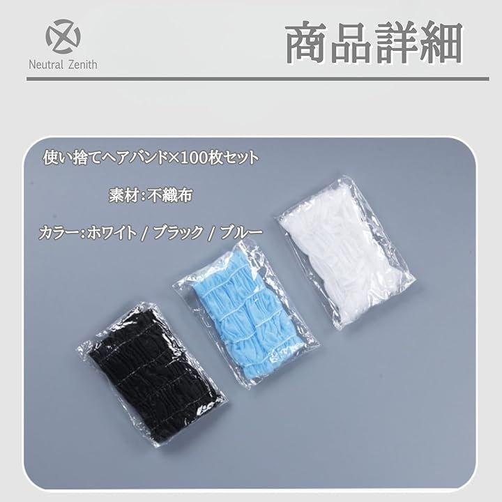 「商品詳細」使い捨てヘアバンドx100枚セット 素材:不織布 カラー:ホワイト / ブラック / ブルー