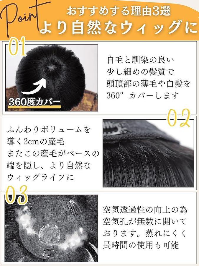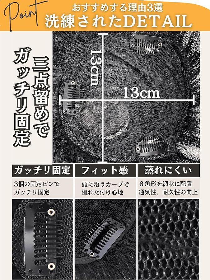高級人毛100%の為、ヘアアイロン、ヘアカット、シャンプー、ドライヤー、ヘアカラーも使用可 「通気性UP」ベース: 強力固定ピンは3つで、より自然なつけ心地を再現致しました。
