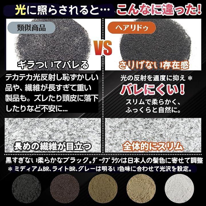 増毛パウダーと聞くと、ギラつき・テカテカ光るなど目立つイメージがありますが、ヘアリドゥは粒が小さく軽量なためふっくらとし、光の反射を抑えてバレにくいのも嬉しいポイントです。
