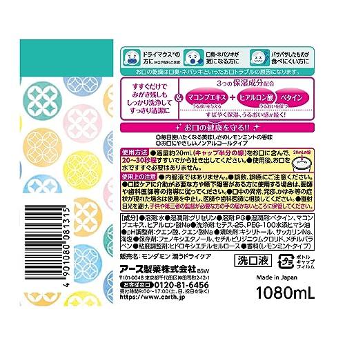 すすぐだけでみがき残しもしっかり洗浄してすっきり清潔に。介護用のマウスウォッシュ(洗口液)。お口の乾燥(ドライマウス)・口臭・ネバツキが気になる方、パサパサしたものが食べにくい方に。すばやく保湿、うるおい感が続く3つの保湿成分配合。介護で気になる口臭ケアに。【香味】レモンミントの香味 【刺激の強さ】低刺激ノンアルコールタイプ(アルコールフリー)【内容量】1080mL 【生産国】日本【製造】アース製薬