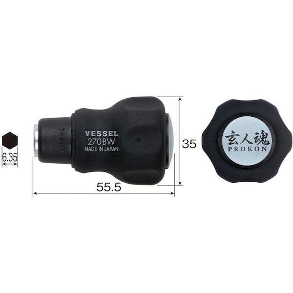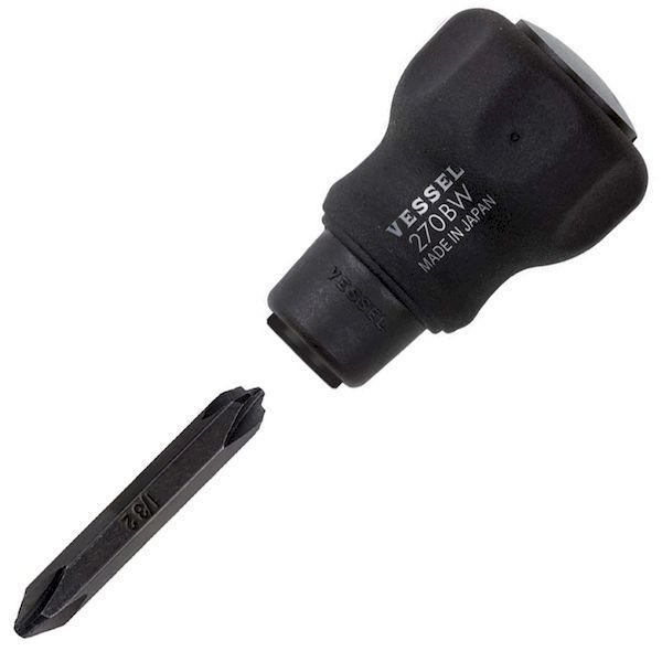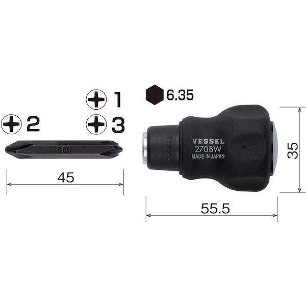 ●電動ドライバー用ビット(対辺6.35mm)を差し込んで、ハンドドライバーとして使用できる”クッションスタビー 差替グリップ”と、3サイズに対応する”コンビPLUS”ビットのセットです。
