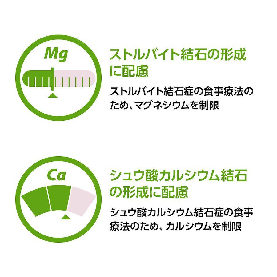 【下部尿路疾患の猫のための食事療法食】猫の下部尿路疾患(ストルバイト結石症・シュウ酸カルシウム結石症)に配慮し、特別に調製された食事療法食です。この食事は、ストルバイト結石、シュウ酸カルシウム結石が形成されにくくするために、マグネシウムやカルシウムなどのミネラル成分を調整しています。原産国:タイ◆ストルバイト結石の形成に配慮◆ ストルバイト結石症の食事療法のため、マグネシウム※1を制限しています。 ※1標準的な自社成猫用フードと比較し、約35%減◆シュウ酸カルシウム結石の形成に配慮◆ シュウ酸カルシウム結石症の食事療法のため、カルシウム※2を制限しています。また、ビタミンDを調整しています。 ※2標準的な自社成猫用フードと比較し、約31%減◆健康的な脳と皮膚、被毛の維持に配慮◆ EPA・DHA、オメガ6脂肪酸を含む栄養素をバランス良く配合。健康的な脳と皮膚、被毛の維持をサポートします。