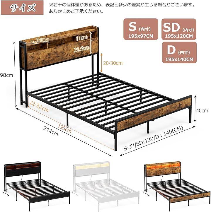 「商品仕様」*商品サイズ(cm):幅97x奥行212x高さ98cm *商品重量:約26kg *梱包サイズ:105.5x34x17.5CM *梱包重量:28kg *材質:本体/スチール(粉体塗装)棚板/MDF *対応マットレスサイズ:シングルサイズ(幅97x長さ195cm) *耐荷重:本体/約350kg ヘッド部棚/約20kg *カラー:ブラック/ホワイト/ビンテージ 組立品/完成品:組立品(2人で組立て時間約45分)。