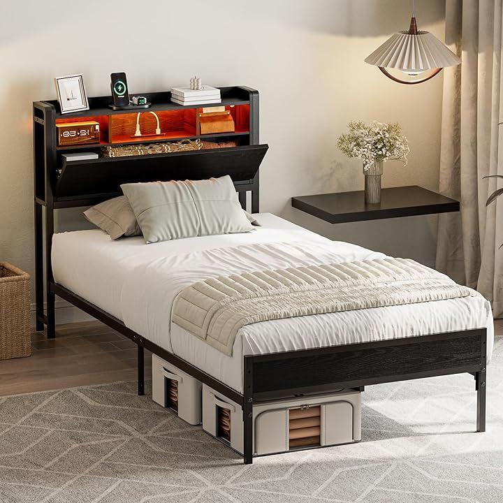 IKIFLY ベッドフレーム シングル 収納宮棚付き パイプベッド コンセント付き シングルベッド スチールベッド LEDライト付き 2段階高さ調整 頑丈 カビ防止 安定性 耐久性 耐荷重350KG 組立簡単 (幅97x奥行212x高さ98cm,S ホワイト)