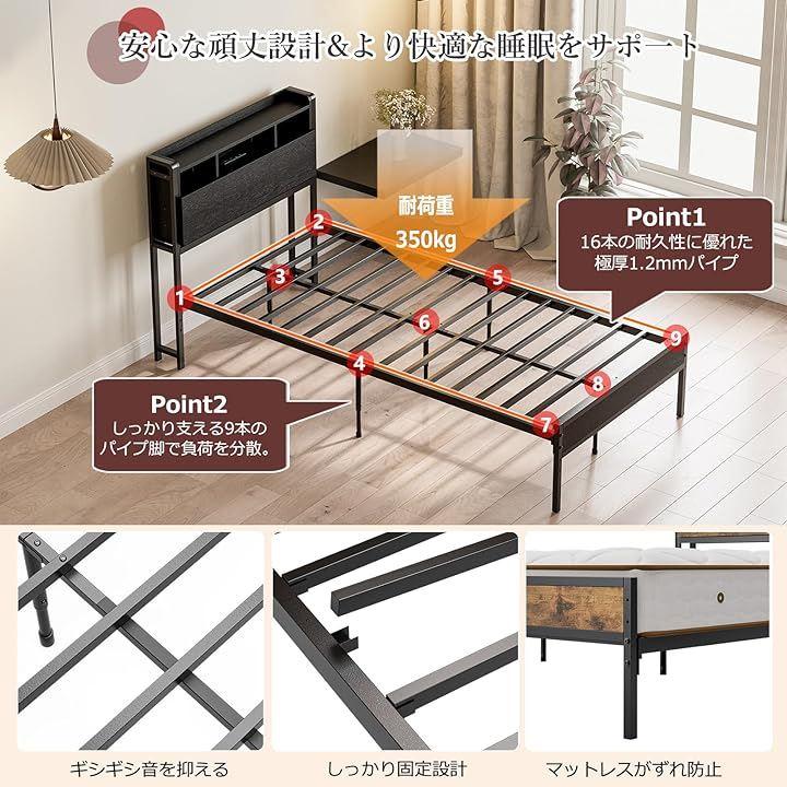 「商品仕様」*商品サイズ(cm):幅97x奥行212x高さ98cm *商品重量:約26kg *梱包サイズ:105.5x34x17.5CM *梱包重量:28kg *材質:本体/スチール(粉体塗装)棚板/MDF *対応マットレスサイズ:シングルサイズ(幅97x長さ195cm) *耐荷重:本体/約350kg ヘッド部棚/約20kg *カラー:ブラック/ホワイト/ビンテージ 組立品/完成品:組立品(2人で組立て時間約45分)。