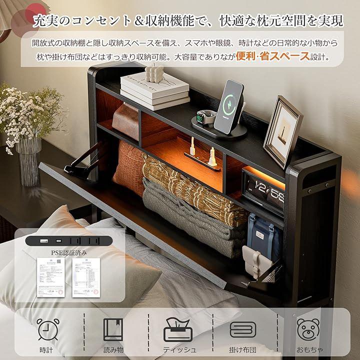 「充実のコンセント&収納機能で、快適な枕元空間を実現」開放式の収納棚と大容量の隠し収納スペースを備え、スマホや眼鏡、時計などの日常的な小物はすぐ手に取れる場所に。