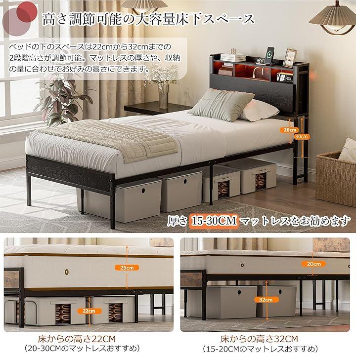 「2段階高さ調整で、床下をまるごと収納スペースに。」ベッドフレームの高さは22cmまたは32cmの2段階で調節可能。