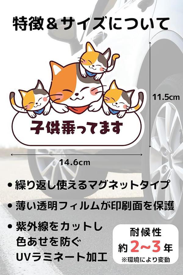 大きめサイズで遠くからでも目立つ安心デザイン 縦11.5cmx横14.6cmの大きめサイズで、後方車両や周囲のドライバーに「子供が乗っています」としっかりアピールできます。