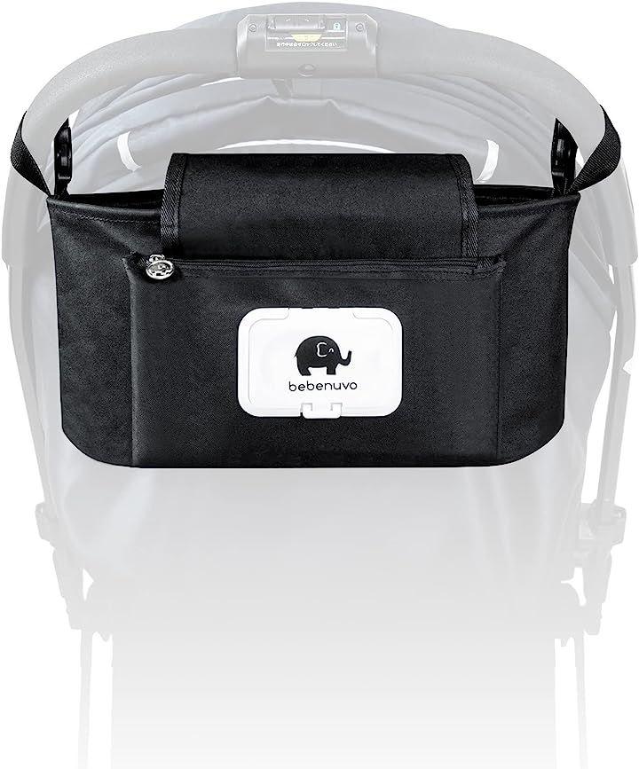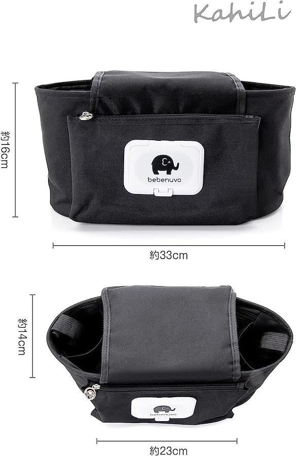「サイズ&カラー」ベビーカーバッグ:約縦14x横33x高さ16cm 重さ200gブラック。