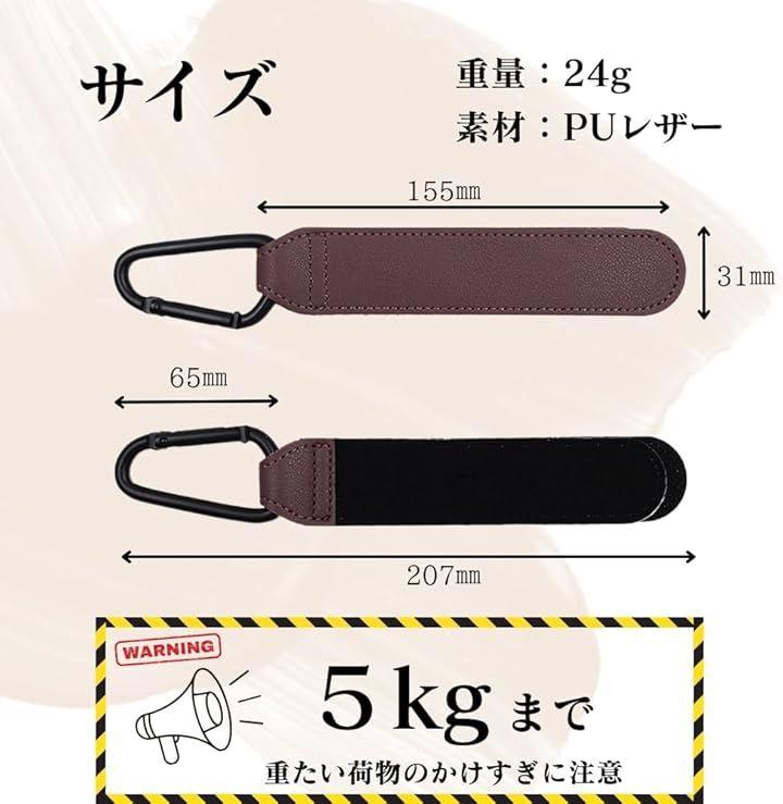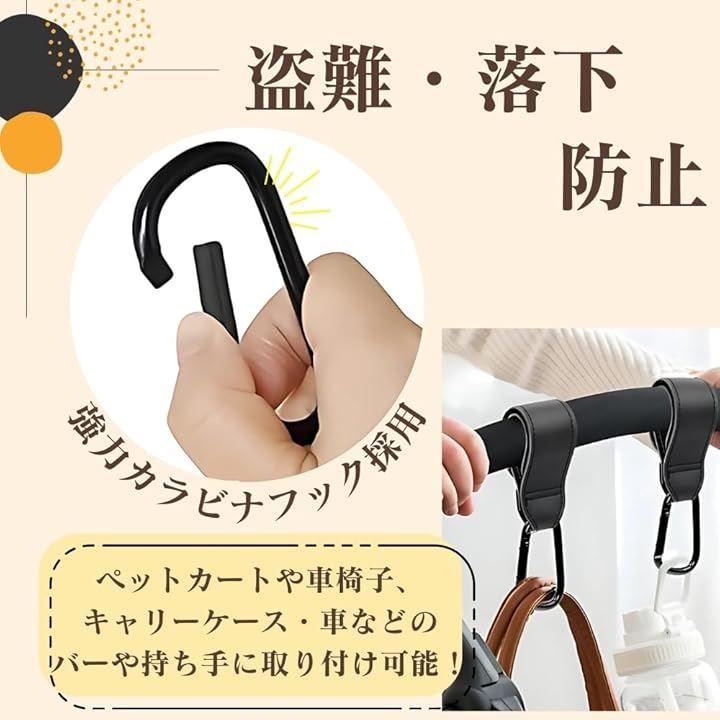 「強力カラビナ仕様で荷物をしっかり固定」アルミ合金製の頑丈なカラビナフックを採用しており、バッグやおもちゃなどをしっかり掛けることができます。